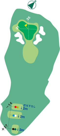 幅広いグリーンで手前から攻めるパー3。ショートしてもアプローチしやすい。左右バンカーには注意。