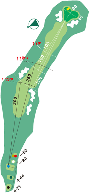 タフなロングパー4で、2打目の距離感が試される。左に逃げすぎると、ピンが見えない