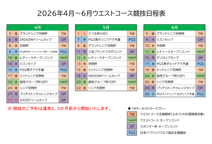 ウエストコース開催の年間における競技日程をお知らせします。